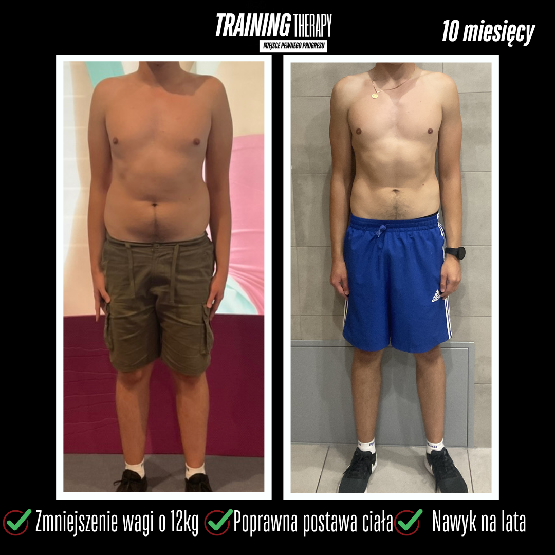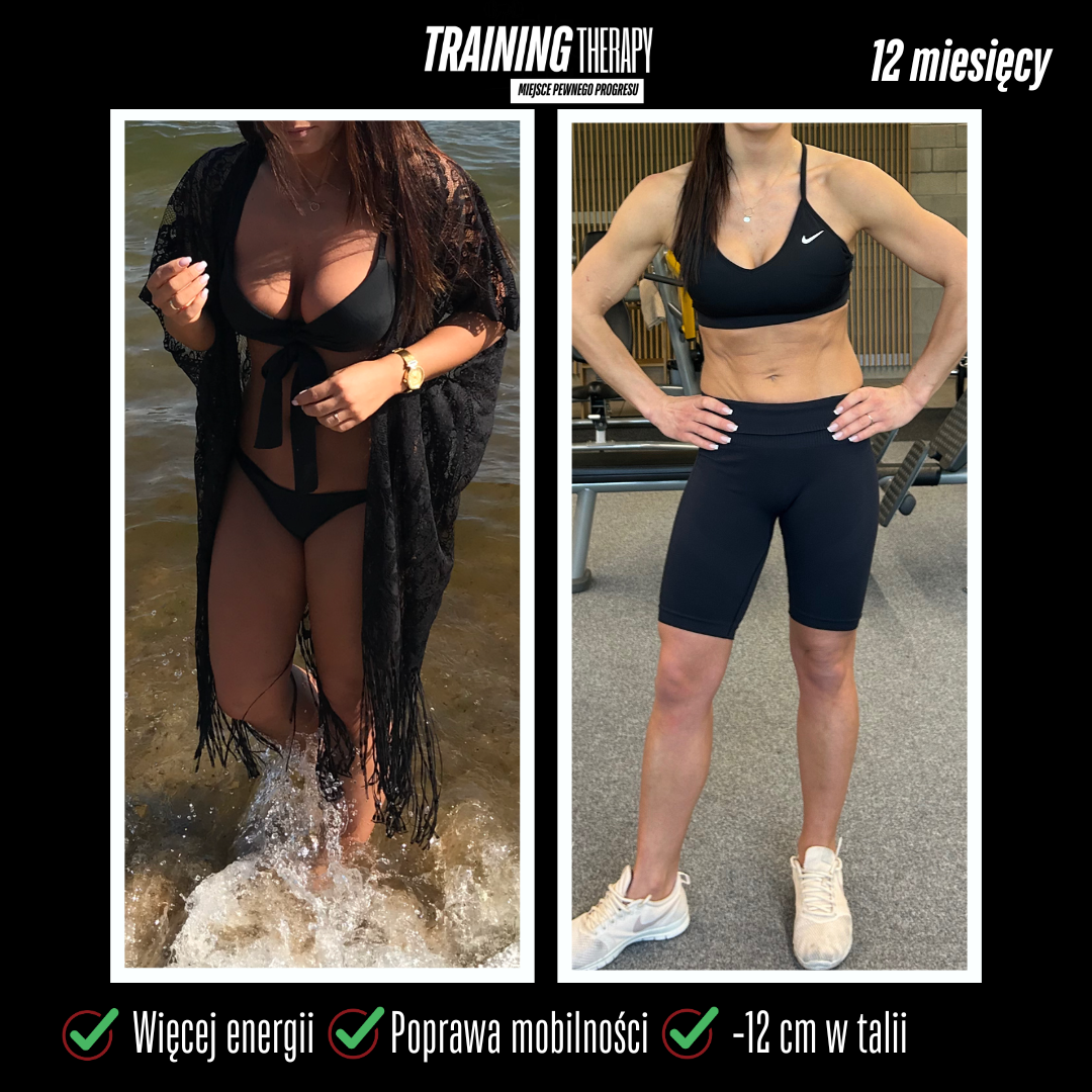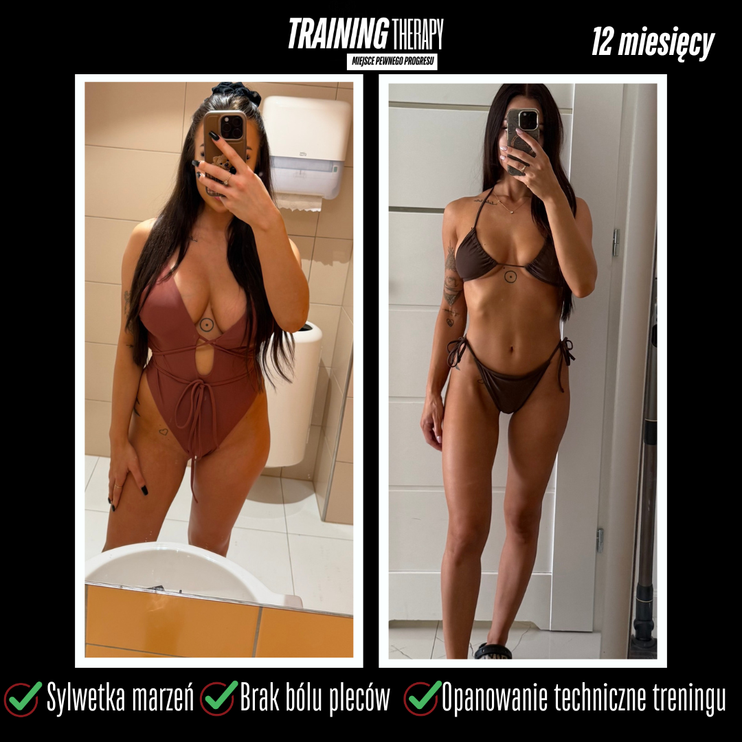 Podczas współpracy z Training Therapy udało mi się osiągnąć wymarzoną sylwetkę w ciągu pół roku — zdjęcia dzieli ponad 10 kg (marzec: 63 kg → wrzesień: 51 kg). Współpraca trwa do dziś — wspólnie dbamy o utrzymanie efektów i dalej pracujemy nad formą.