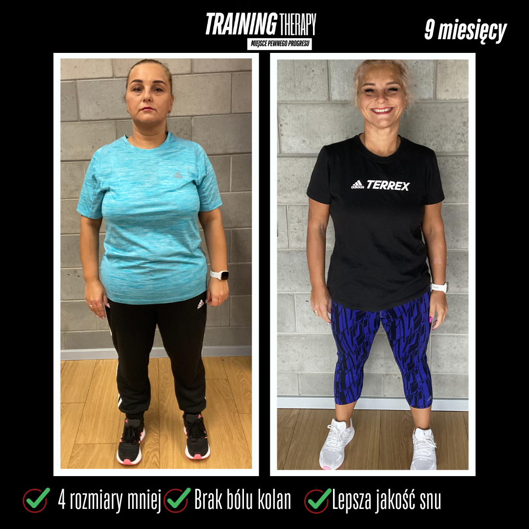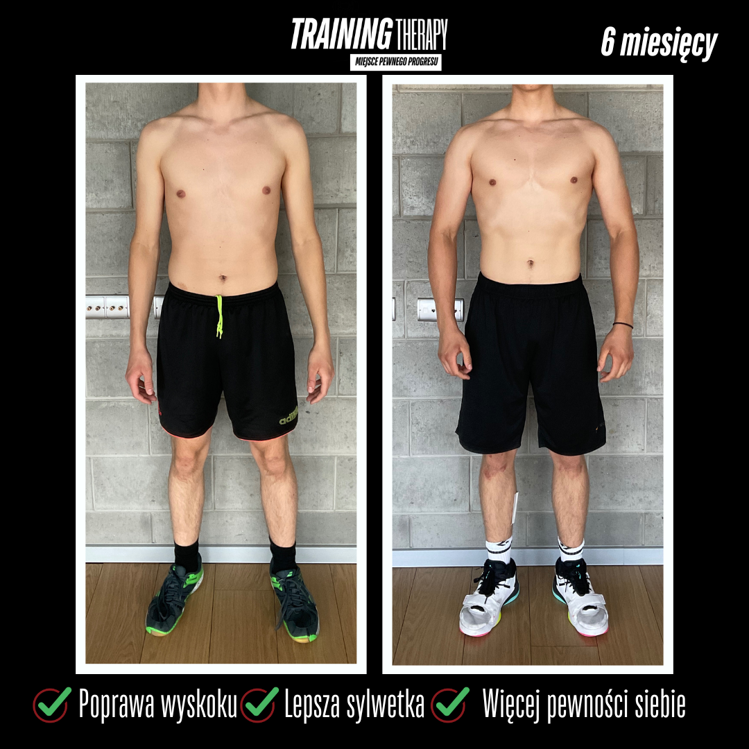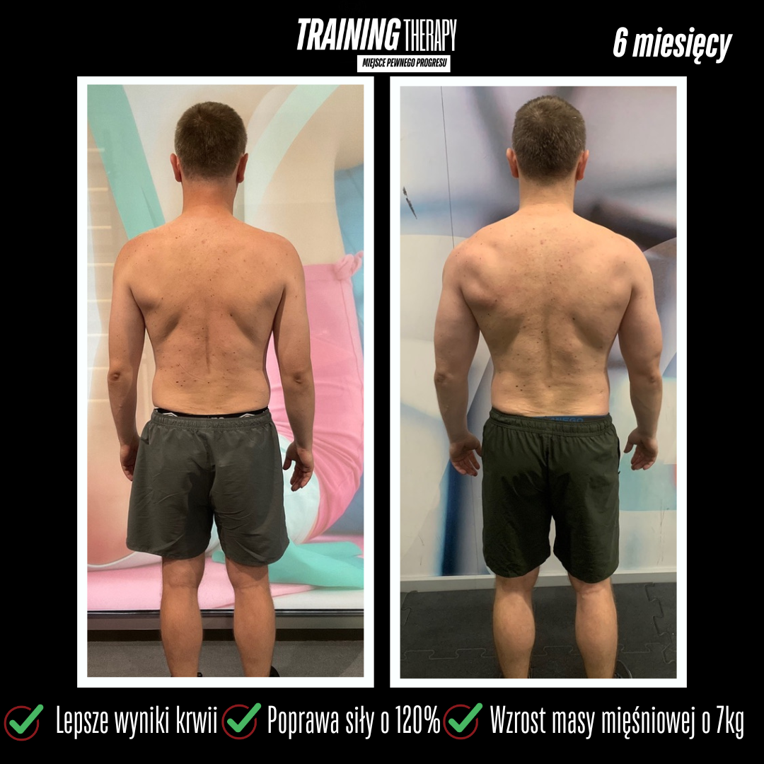 Podczas współpracy z Training Therapy udało mi się osiągnąć wymarzoną sylwetkę w ciągu pół roku — zdjęcia dzieli ponad 10 kg (marzec: 63 kg → wrzesień: 51 kg). Współpraca trwa do dziś — wspólnie dbamy o utrzymanie efektów i dalej pracujemy nad formą.